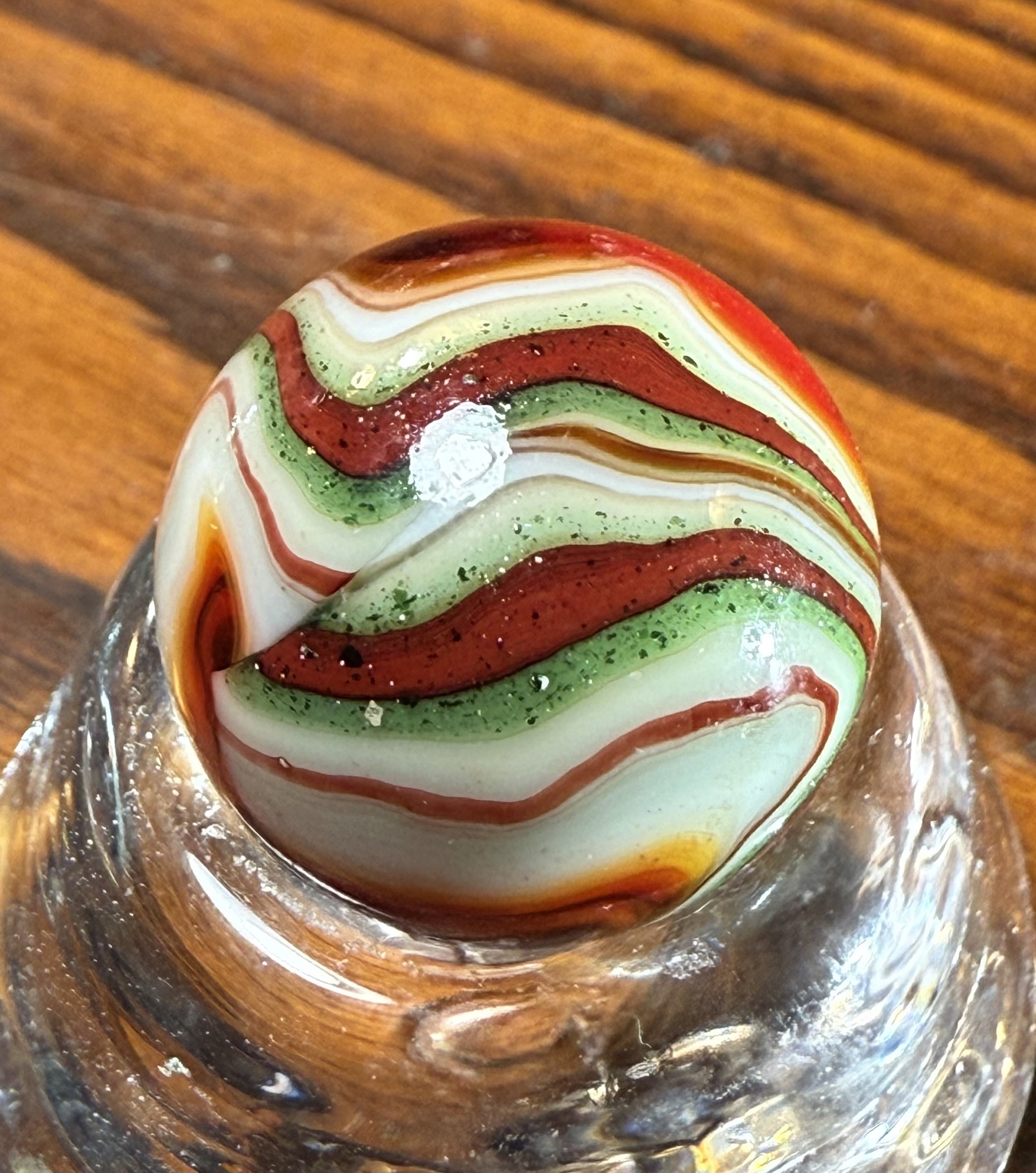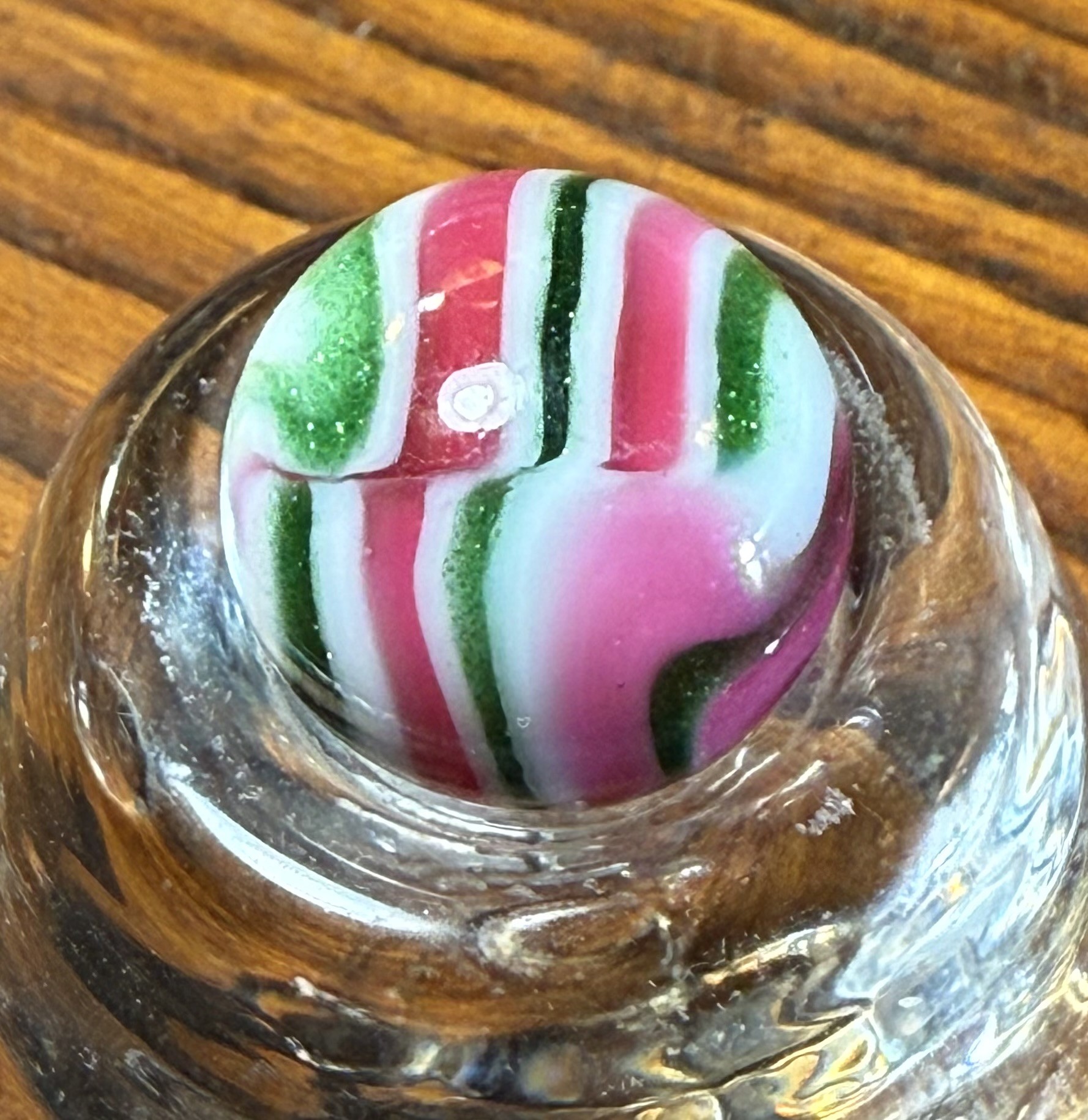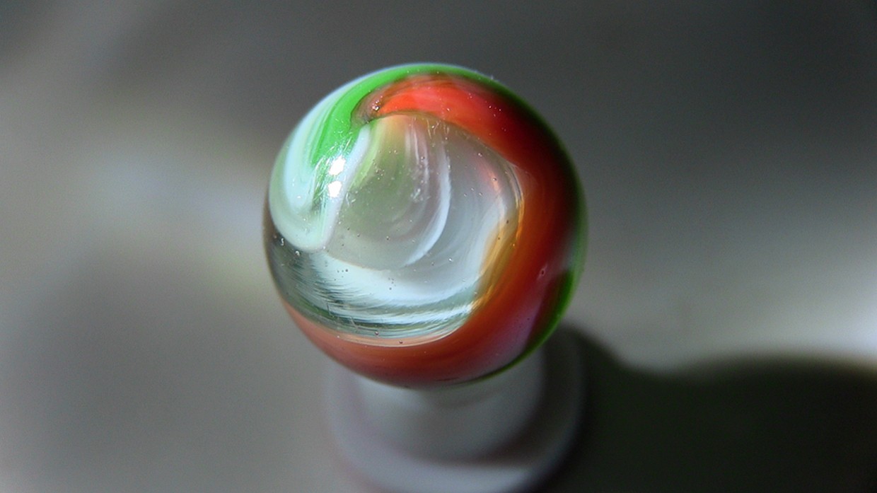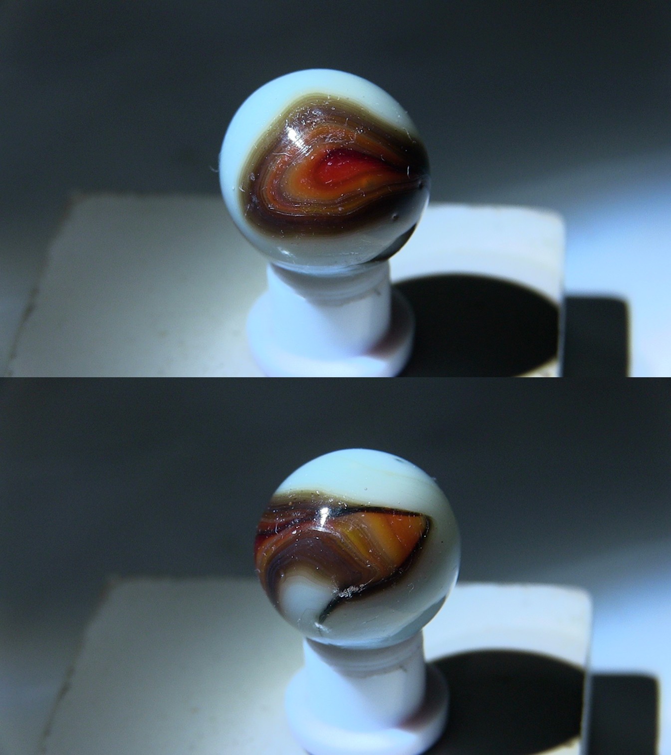 Annealing Fracture IMO, even if you can or can't feel it, some are subsurface and can't be felt with your fingernail some aren't, 100% machine made whether you can see where it was sheared off or not, no indications of it being a single gather IMO. A HTF marble yes, still not a 9.9, 9.0 mint - because of the fracture IMO, rarity doesn't boost condition. Pontils always refer to handmades, where the cane was cut off with shears by hand. Machine mades were cut off with shears to, but by a machine, so no pontils, shear marks, if they can be found. BTW- No such thing as "non fluorescing Ade glass" since that's what ade entails, if it has an ade base it should react to uv light. A good marble will sell itself in my experience. If you like it buy it, whatever makes you happy, as long as you're satisfied but I find the description more than misleading IMO.
