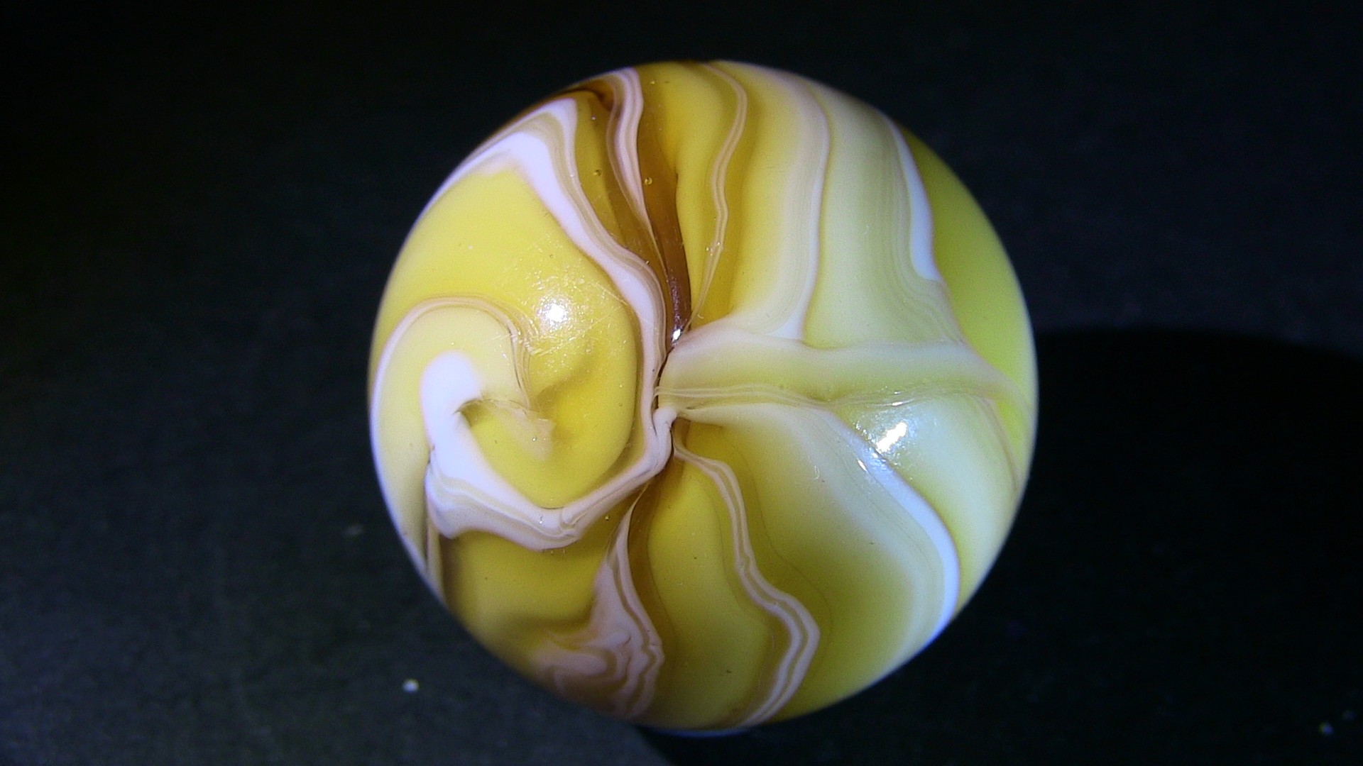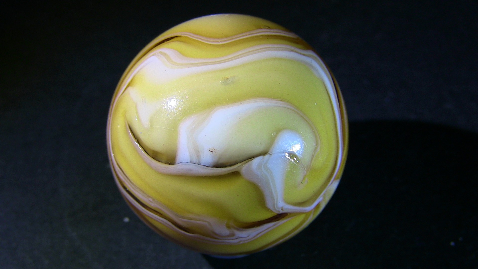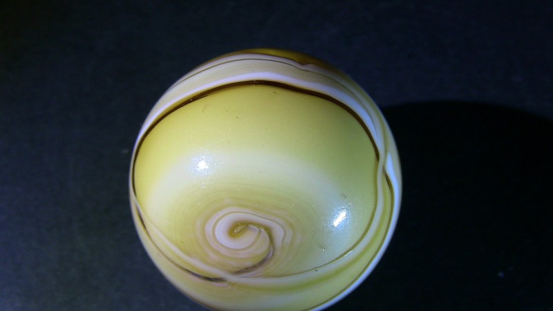 Nothing exceptional, but this AV-loaded marble identified as MK, I found it in a group of marbles from the latest Heaton dig while I was cleaning them. Here is Ron Shepherd's comment during the identification... "I agree. We know that possibly Heaton and for sure that Jack Bogard bought and sold marbles, and cullet with Marble King. I also know for sure that Jack Bogard bought marbles and equipment from Ravenswood. That was according to a talk with Jack by myself. The same day he showed me a set of Ravenswood machine rolls he bought at Ravenswood." Below, I also show a small video to better highlight the aventurine 1.mp43 points