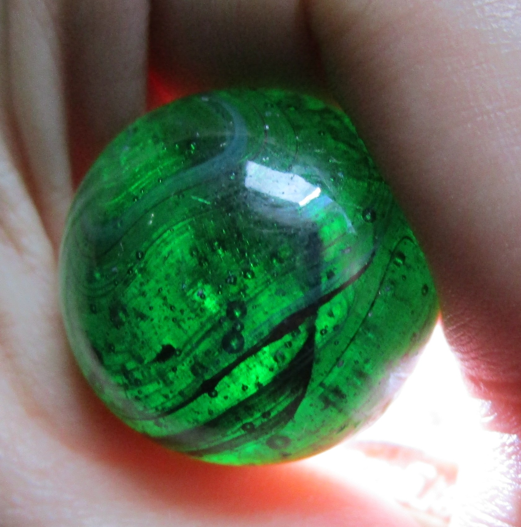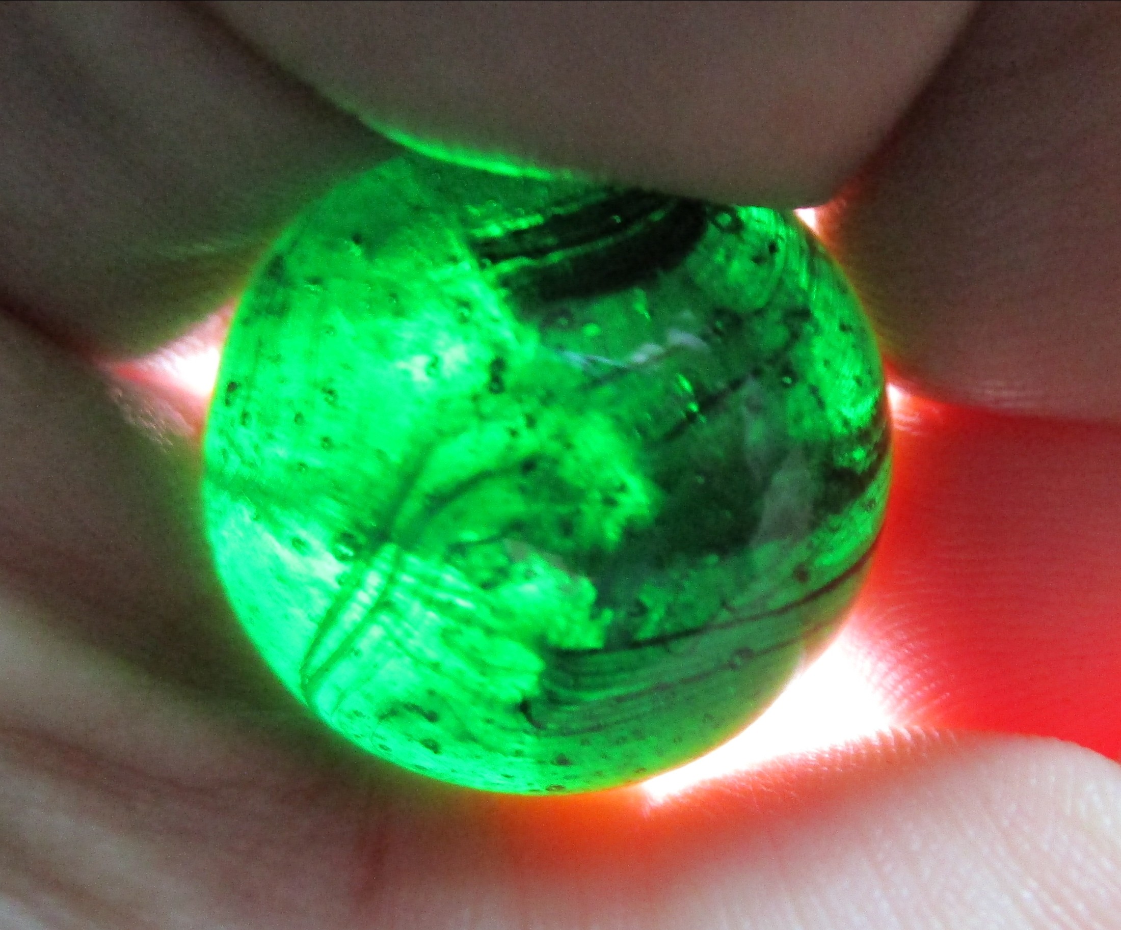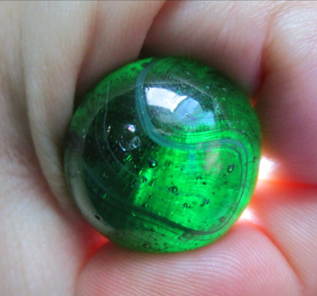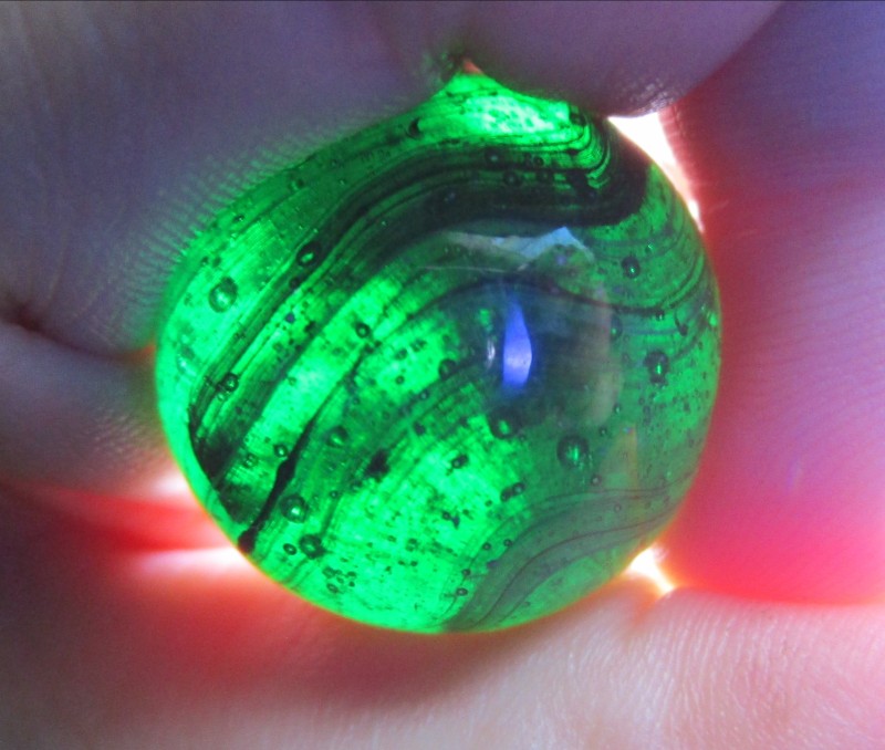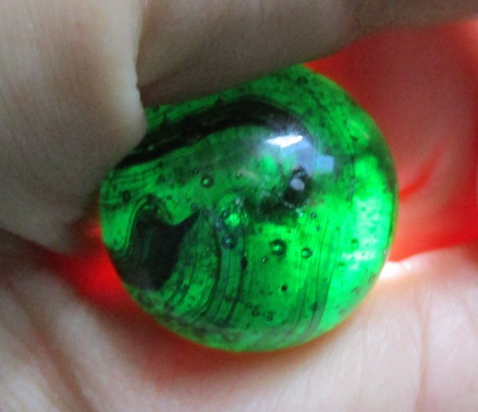 The collection this came from, he was a collector of all sorts of stuff but not an avid collector, when his son inherited everything and the family sorted everything out no one had interest in the marbles or teddy bears so his son, our friend, set the marbles out on a vending table at a few flea markets. He said at first people were picking though excitedly and happily giving him $5 each on them, and he did that maybe a year or two before he gave them to me to figure out. What's left has turned out to be run of the mill from beginning to about mid 90s. I did find an MFC, an Akro Cardinal Red, several corkscrews, a few slags I am fairly certain were CAC, many clays of course, so I assume what ever of really obviously collectible ones got fished out. I found this mixed in with the clearies and industrial ones. ๐