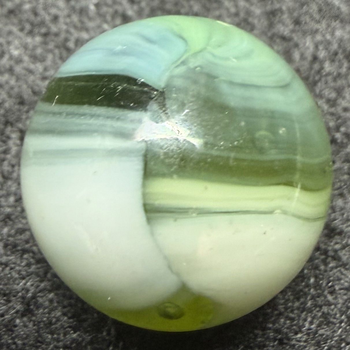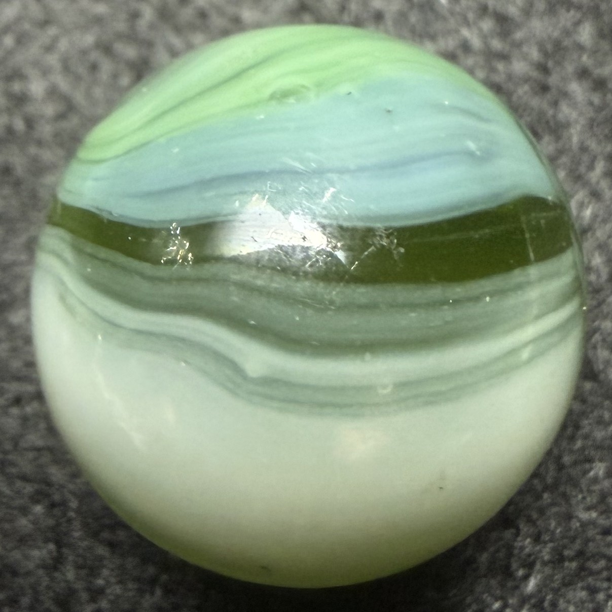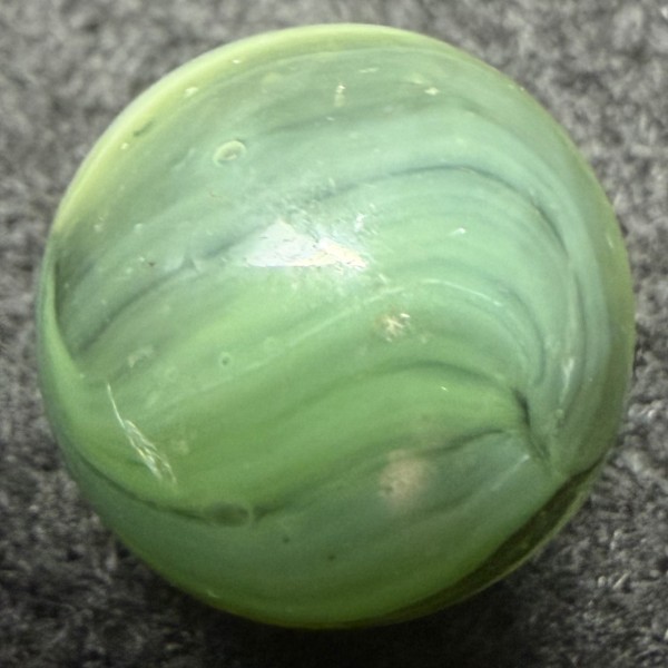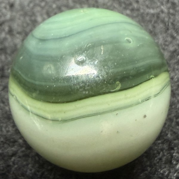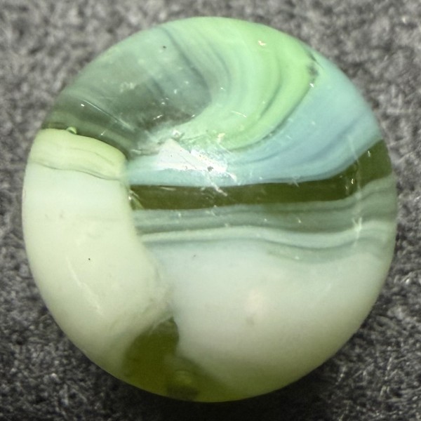 This marble is about 5/8" White, Green, and a subtle Teal on a transparent Green base glass. The seams make me think MK, but might this be a Master Marble?