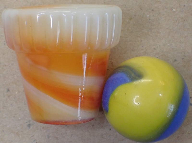 teajayo Posted March 3, 2024 Report Share Posted March 3, 2024 On 2/12/2024 at 4:03 PM, akroorka said: Alan, the grooves did serve a purpose, helping to spin the molten glass. I cannot disagree with what you have said--more than likely, imho, these spinner cups broke off of the foundation due to the heat and were replaced. Carbon is very heat insensitive but it will break down over time. The likely culprit is the way that these cups were attached. Marble--On!! We all appreciate your input teajayo--but. The reason that Akro used carbon is because molten glass will not stick to it. Marble—On!! I didn't say anything about why or why not Akro used carbon. I simply stated the grooves in the carbon cups were not what formed a corkscrew. this is not my opinion. This is fact straight patent documents explaining the machine parts in detail from the inventor who was not Akro or an employee of Akro. The grooves were carved randomly in cups yes... just to aid in keeping the molten flow from splashing right out. All this happened in less than a second. All I stated was... the grooves did not cause a gob to form a spiral pattern. That is fact. I explaing how the carbon cups were attched to the cam arm. I even showed patent pictures in a post above. 6 set screws held a plate the secured the cup via a groove around its base to the cam arm. This is clearly pictured and described in a patent image I posted above. There really is zero speculation on it. The patent also states... cups may or may not have grooves. So I'm inputting what I have researched for a long time. I won't bother sharing those things again. By the way, I'm leaving Rogers after 3 days here again and I mentioned to him people don't believe the oxblood spirals and ribbons like the two I posted here are Akro and he laughed. They're all dug and very few exist making them pretty rare. They're real, they're Akro. I don't post fake stuff. I do expose fake stuff though.. fake Akro stuff. I don't speculate. Some things can not be proved, but what can be should certainly be accepted and not discarded and guessed at. 1 Link to comment Share on other sites More sharing options...